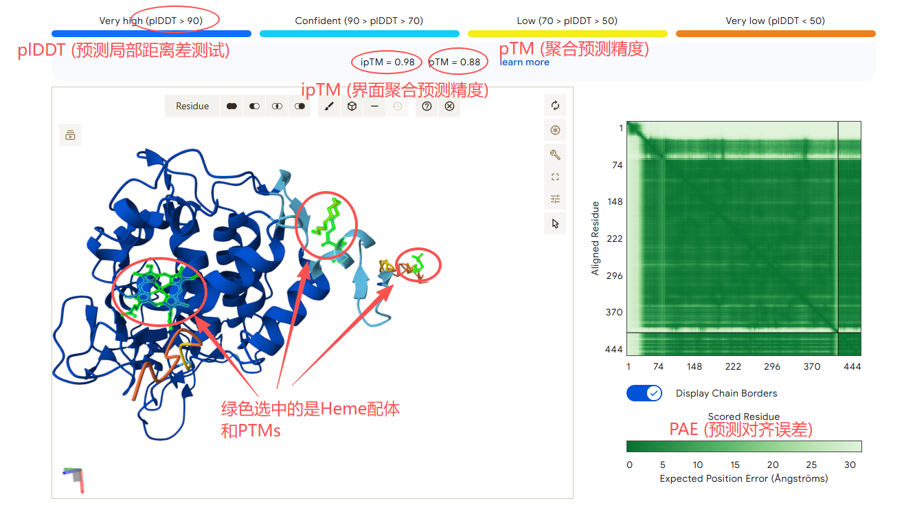 - plDDT:评估每个原子的局部可靠性(对于 PTM 和小分子同样适用)。