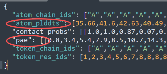 (2)从 “” 文件中可以查看每个原子的 plDDT 值,以及查看 相对位置的 PAE (预测对齐误差) 值。