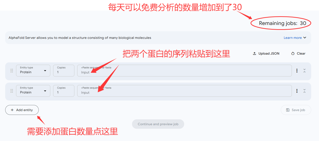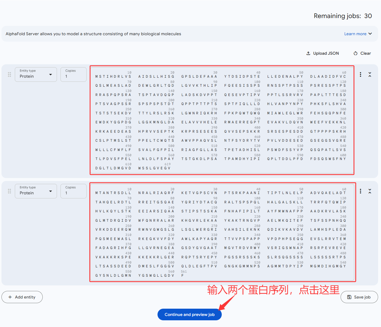 2、在下面的输入框里面输入两个蛋白的序列,之后点击下面的 “Continue and preview job”。