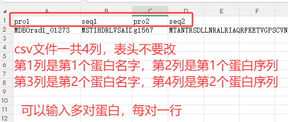 跟单个蛋白的结构预测不同,这里要预测的是两个蛋白的相互作用,因此我们的输入文件修改为一个csv文件,文件的格式如下: