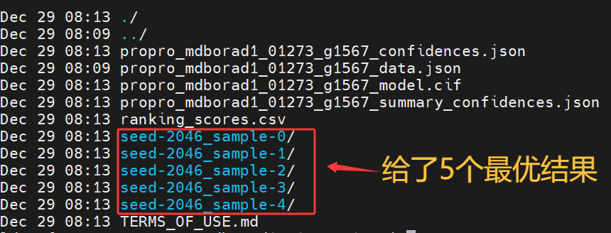 进入目录之后可以看到结果,软件给出来了5个最优的结果,如果使用的序列和Seeds相同,那么生成的文件是完全一致的。