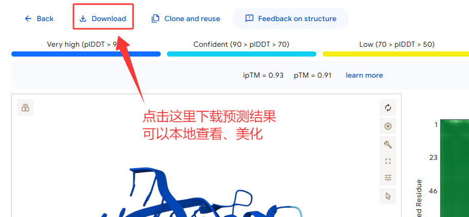 下图就是AlphaFold3服务器给出来的最好的结果,但是从给定的参数看,实际上的效果并不好。