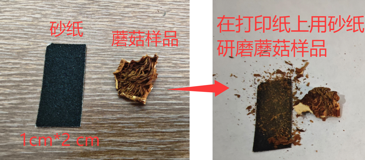 如果样品有冻干的粉末,最好用冻干的粉末,如果没有冻干的粉末,只有子实体,可以用砂纸进行研磨,将新的砂纸剪成1cm * 2cm的小块,在一片新的打印纸上面用砂纸研磨蘑菇样品,研磨出粉末,将粉末加入到裂解液中。砂纸和打印纸都是一次性的。